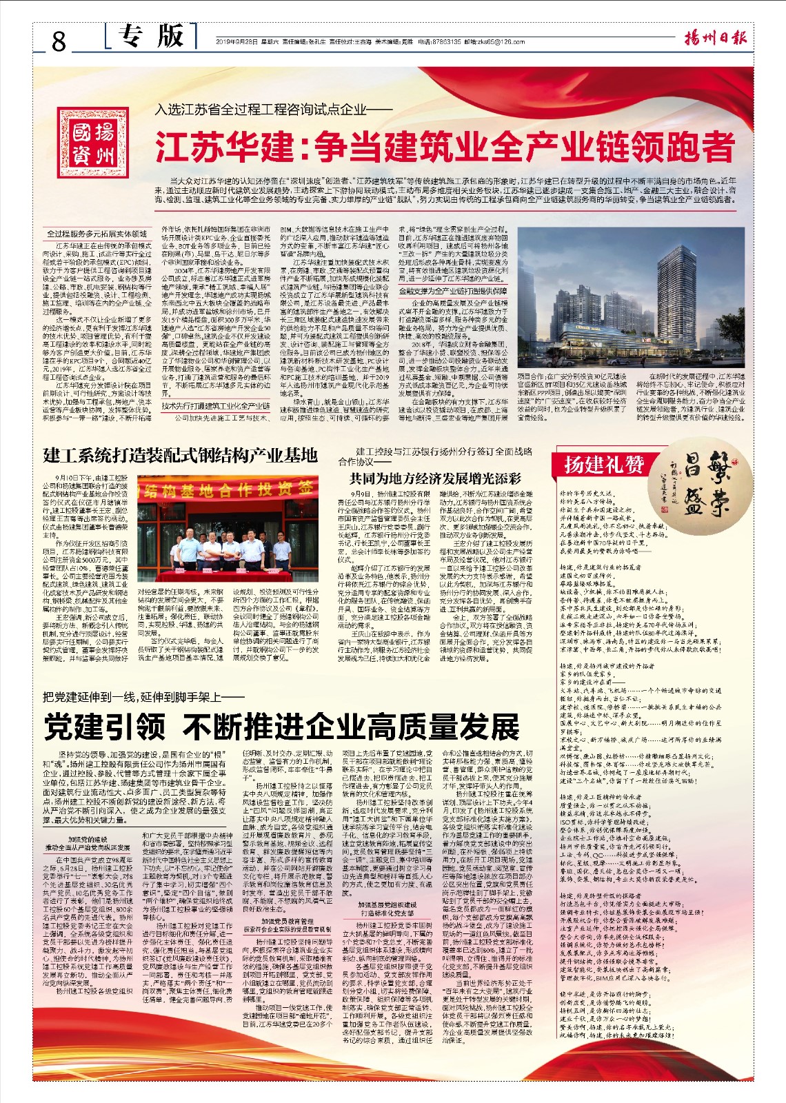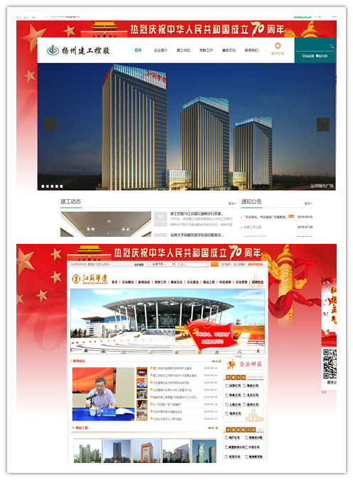 为了充分展示新中国成立70年来特别是党的十八大以来建工控股改革发展所取得的历史性成就,公司推出一期《扬州日报》国庆专版,并对公司网站进行了全面改版,更加符合当下信息宣传需要。系统企业江苏华建、扬建集团参加由市政府举办的2019运河文化嘉年华活动,用精心装饰的花船点亮了千年运河的独特风姿。江苏华建同时联合扬州广电推出了庆祝新中国成立70周年特别策划——《愿以此身长报国》,展现了一个地方国企的初心和担当。